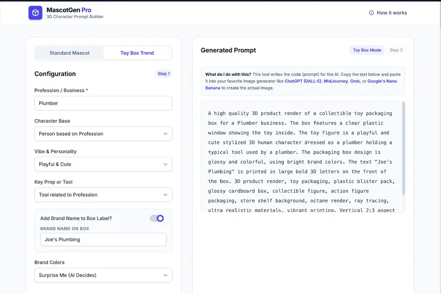Generate mascot-style prompt ideas tailored to your business and industry. Great for creating friendly, recognizable branding visuals.